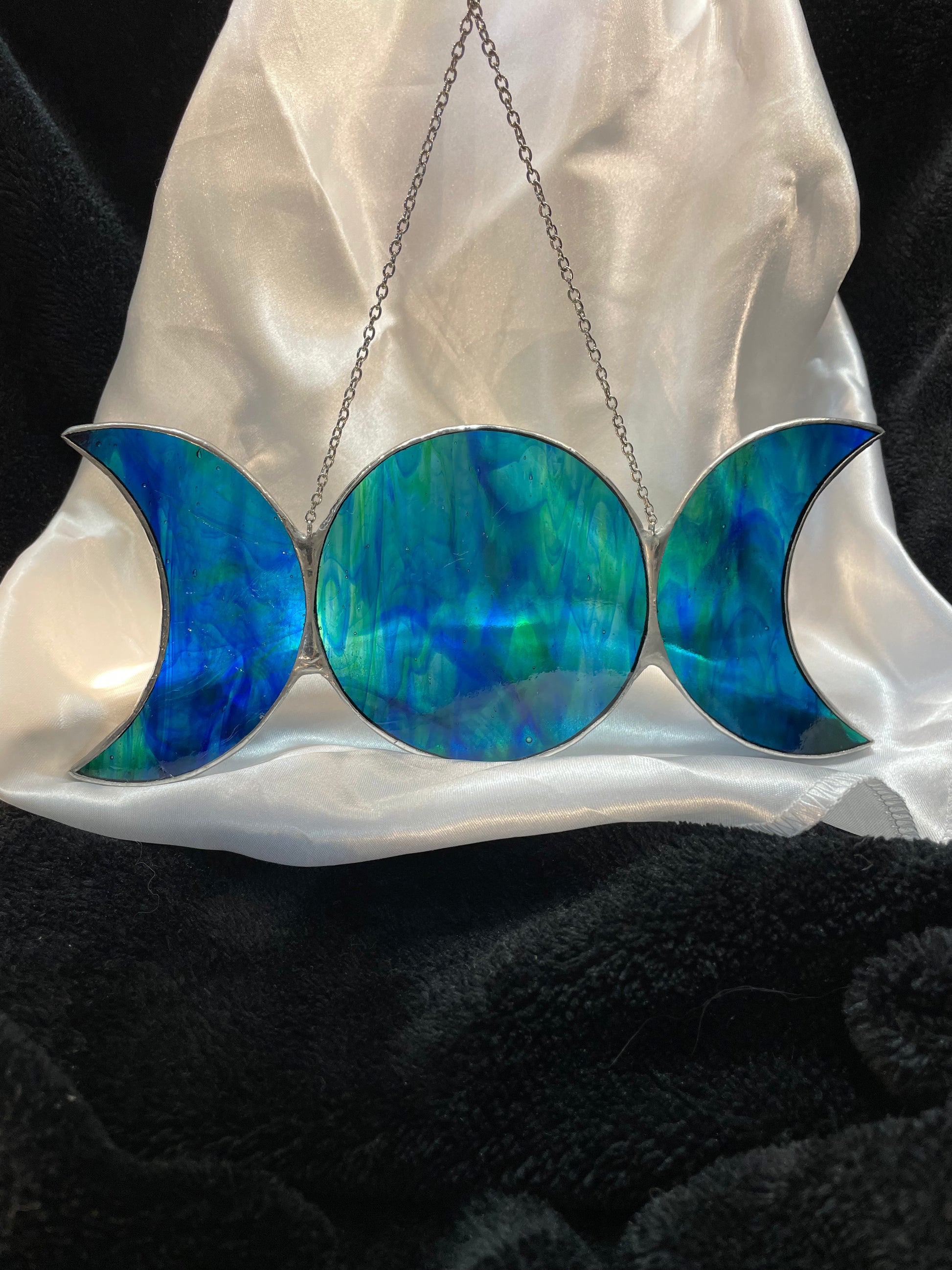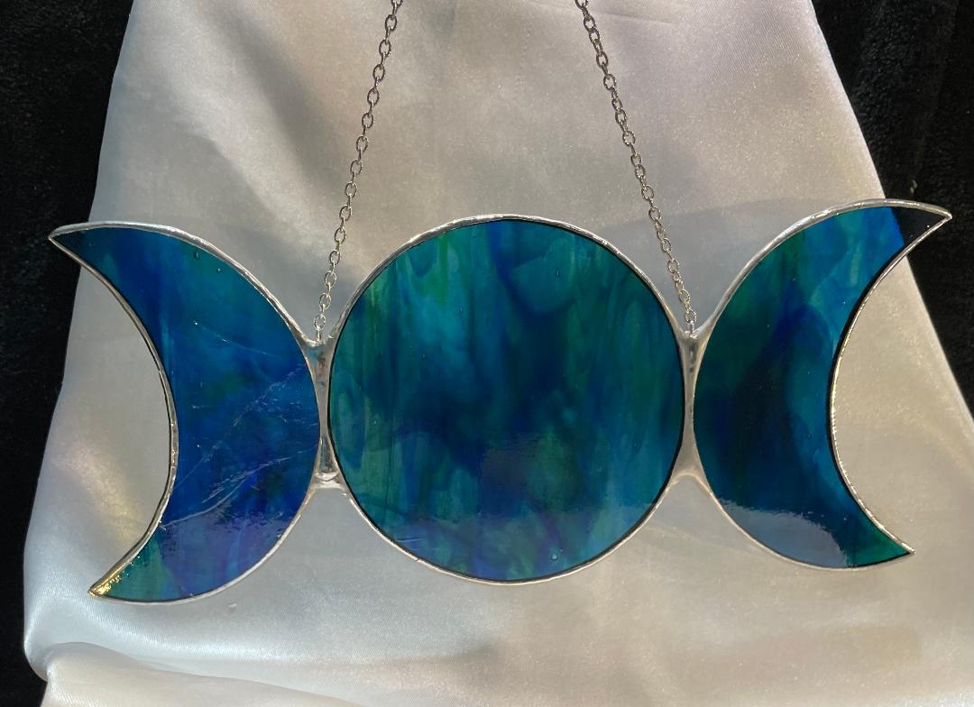 Immerse yourself in the ethereal glow of the Moon stained glass art piece. With two crescent moons framing the central piece, this hand-crafted masterpiece radiates beauty and tranquility. Made with high-quality stained glass and expertly crafted with copper foil and 60/40 solder, this stunning piece will elevate any space with its enchanting presence.