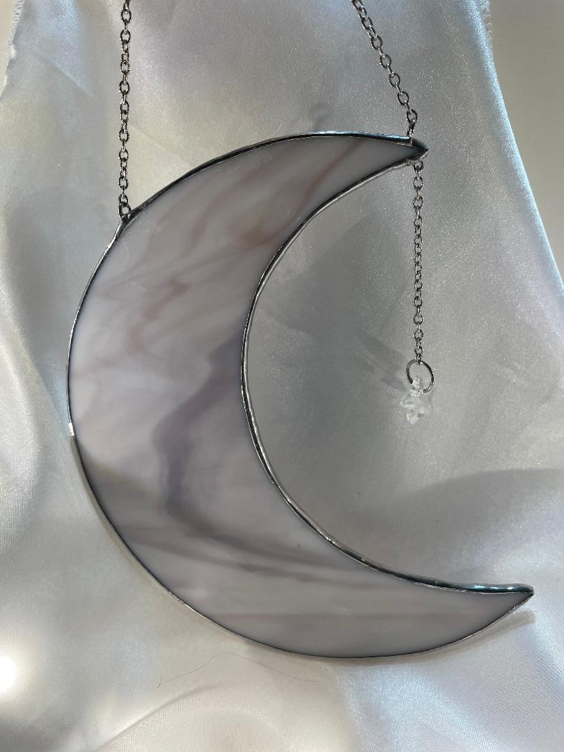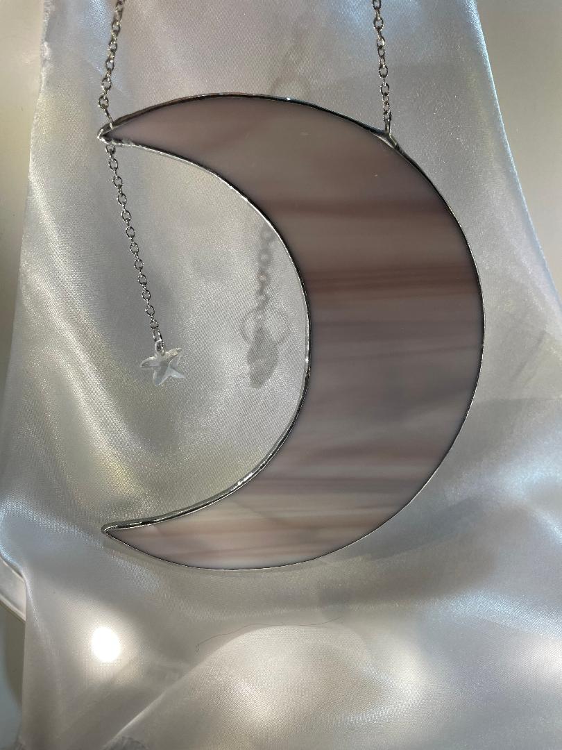 Add some celestial charm to your home with a hand-crafted Moon stained glass decoration. Complete with a star charm and made with high-quality materials like copper foil and 60/40 solder, this large Moon will surely brighten up any room. Hang it in a window and let the light shine through! (No telescope required!)