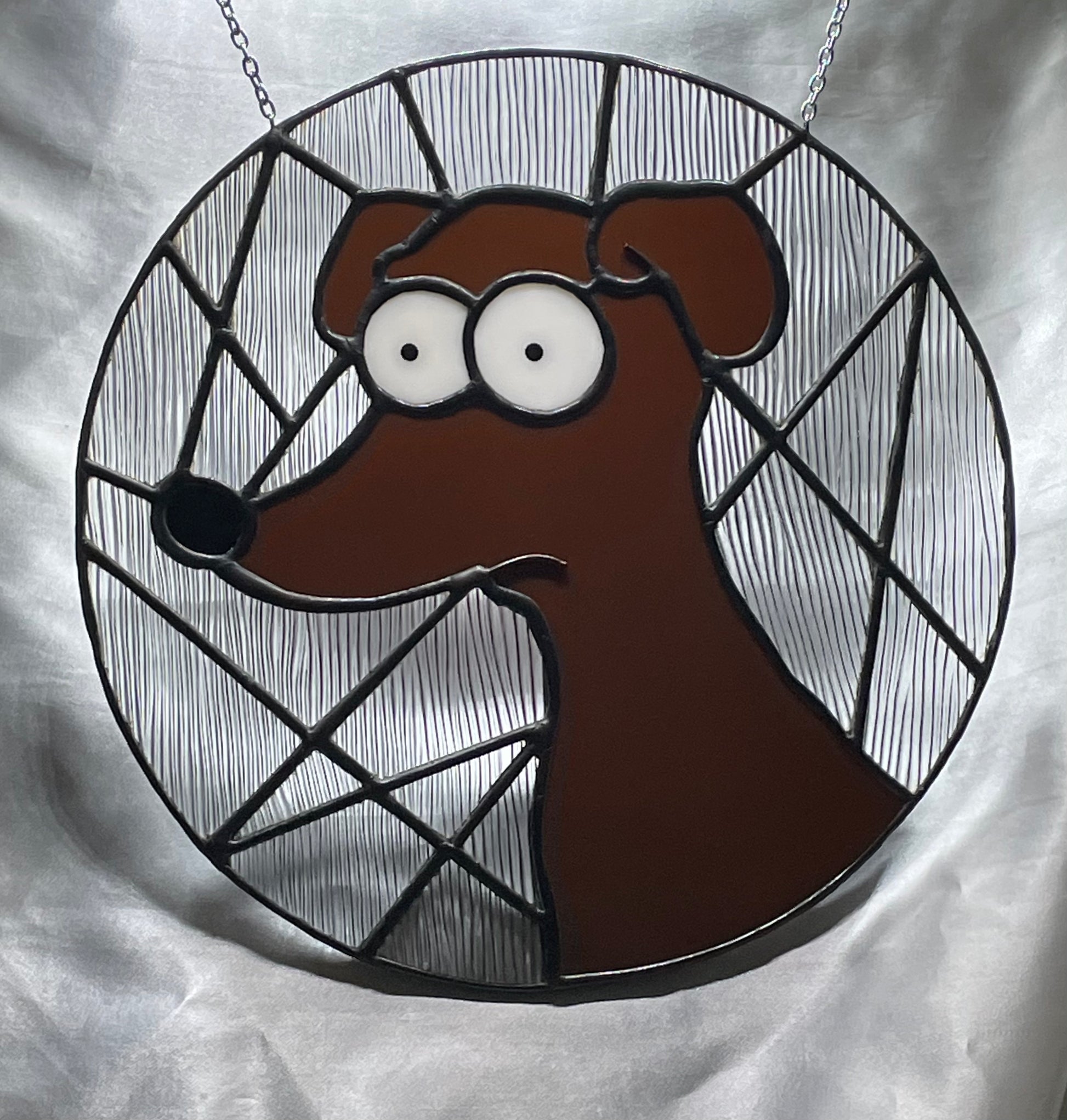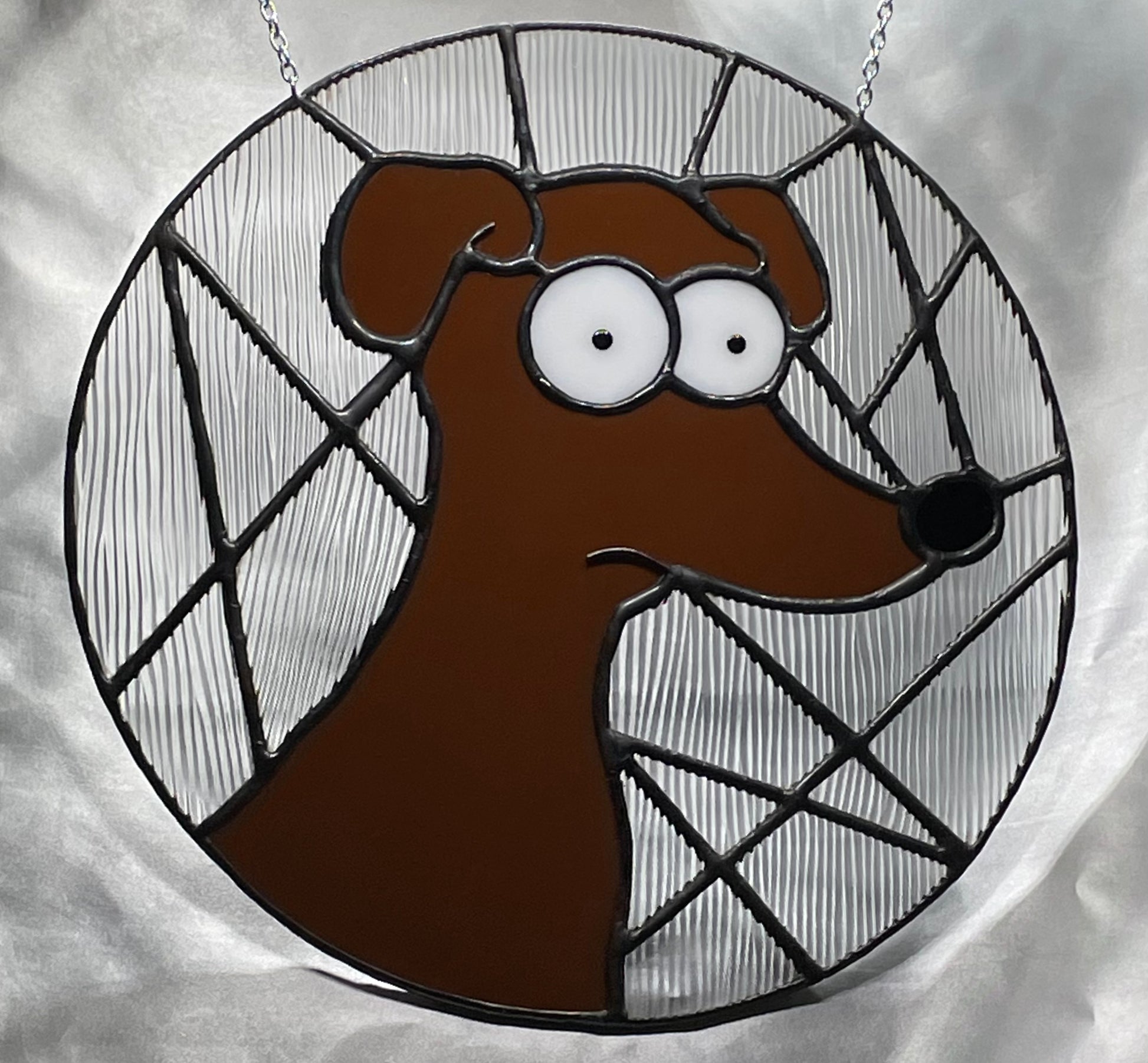 Meet "Santas Little Helper", the perfect addition to any Simpson fan's collection. This handmade stained glass dog features intricate 60/40 solder and a bold black patina, making it a unique and eye-catching piece. A playful nod to everyone's favorite canine companion, this little helper is ready to bring some charm to your home.
