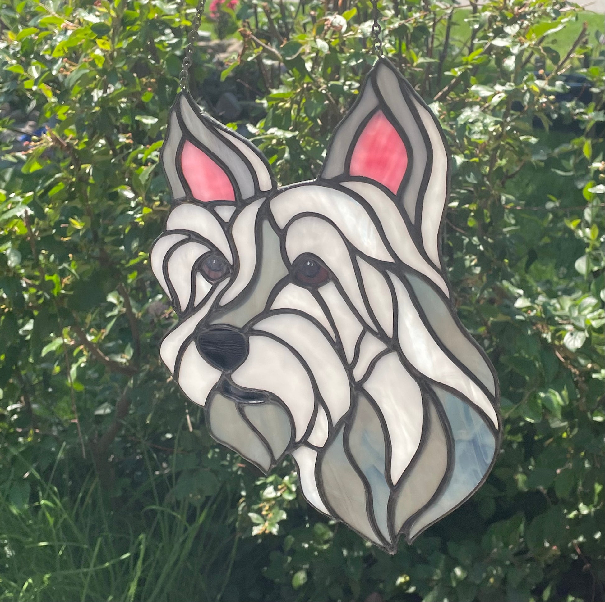 This stained glass Scotty Dog is a handmade masterpiece! Made with 60/40 solder and copper wire, it has a unique charm. The finishing touch of black patina adds a touch of sophistication. Bring a playful twist to your home decor with this quirky pup!